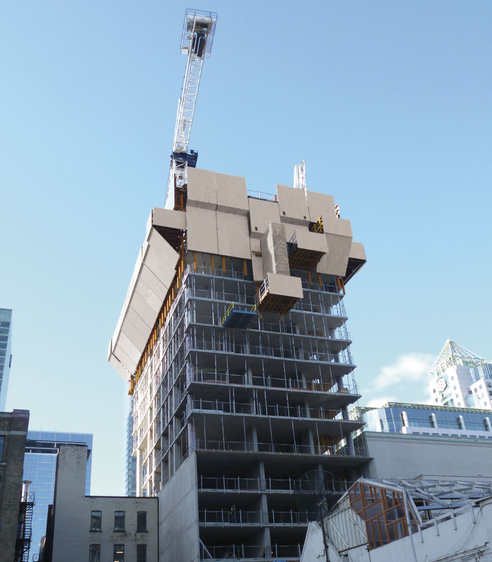 - Debris section: extension of the slab as perimeter working and material storage platform. It avoids falling debris when removing formwork tables and provides a large advertising area towards the street.