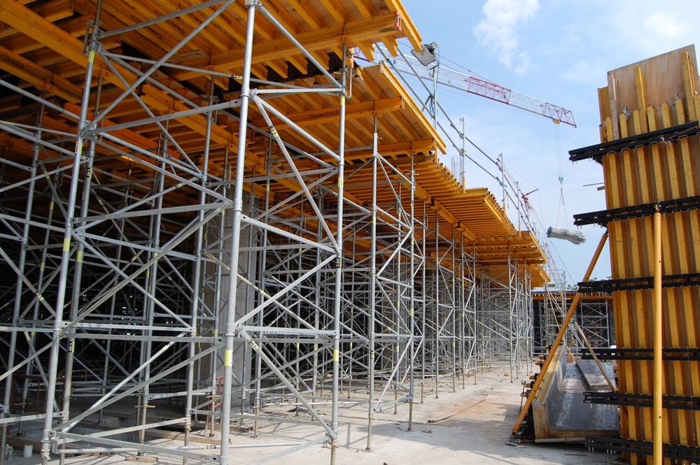 The slabs and hanging beams on the standard floors were executed with VR Tables and EP Props, whose range made it possible to adapt to the heights of each floor. This horizontal formwork was ideal for all of the slabs, and enabled a fast assembly with the minimum use of time in horizontal and vertical site movements. Additionally, on the first three floors, each of 11 m, VRTables and T-60 Shoring System were used, along with ENKOFLEX Horizontal Formwork.