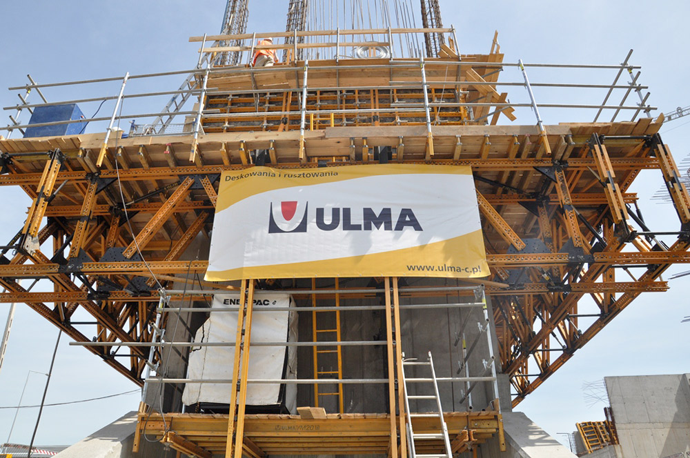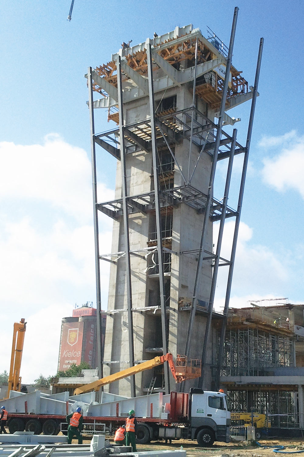 The interior of the structure was built with the KSP Shaft Platform hoisted by crane and making up the formwork support platform. BRIO Modular Scaffolding ensured the vertical communication between different levels. T-60 Shoring and timber beams slab formwork were used for the construction of the horizontal structures.