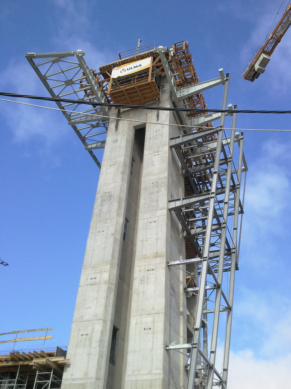 The ATR self-climbing system was used for the construction of the two 90 cm thick outside walls. The other two walls with a thickness of 15 and 25 cm and protruding structural steel parts did not suit the use of the ATR system.