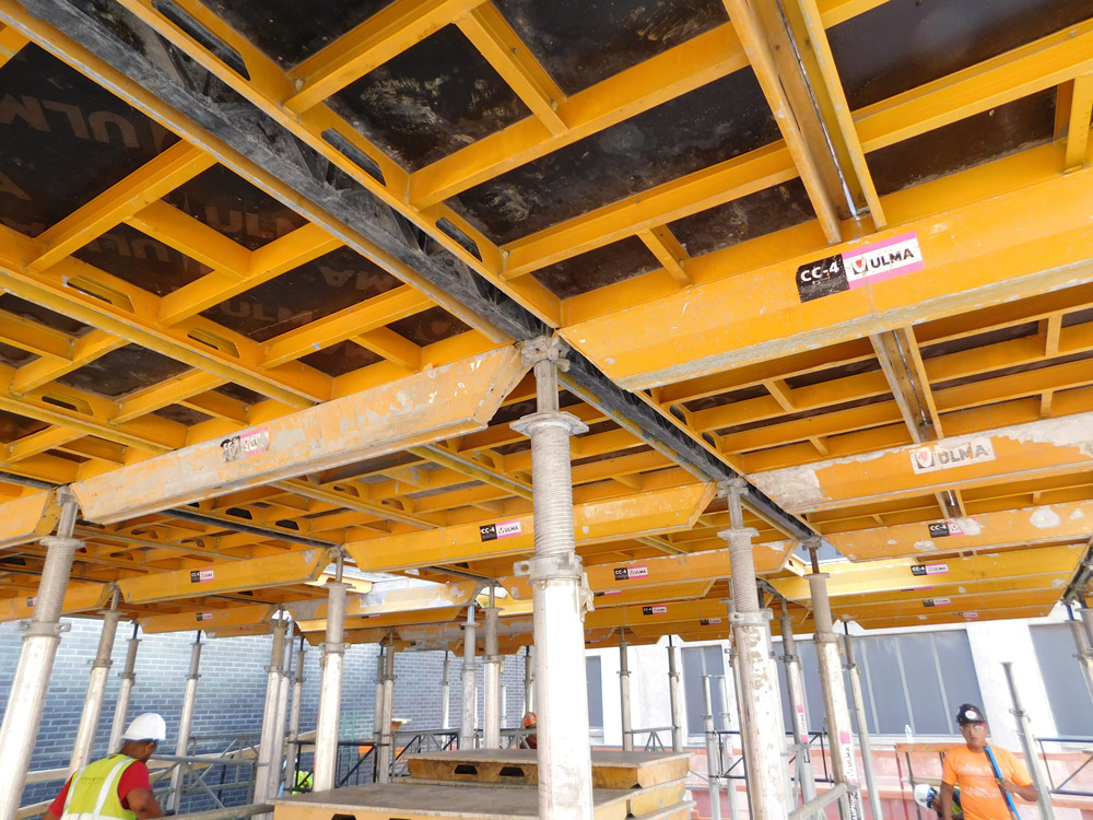 For the slab construction and support ULMA provided the CC-4 panel shoring system. This system is ideal for the construction of flat slabs with regular dimensions. This system can be used with both our steel EP and aluminum ALUPROP post shore systems. The CC-4 can be installed entirely from the ground therefore promoting safety.
