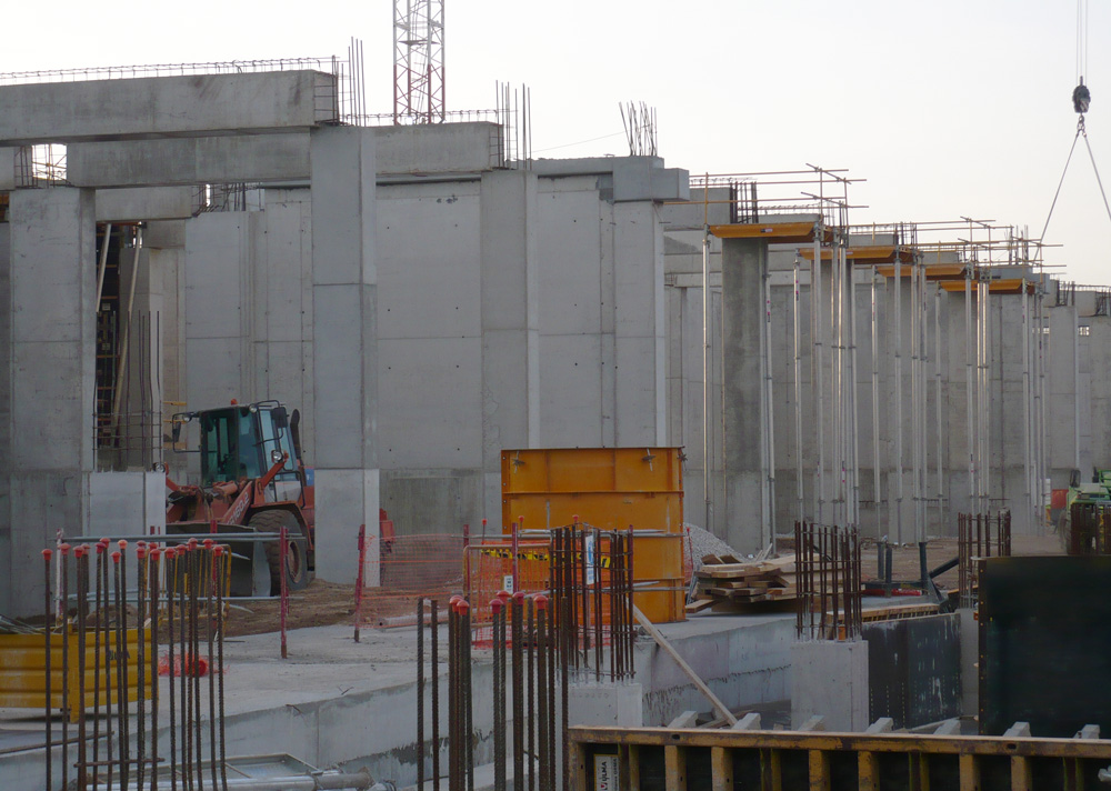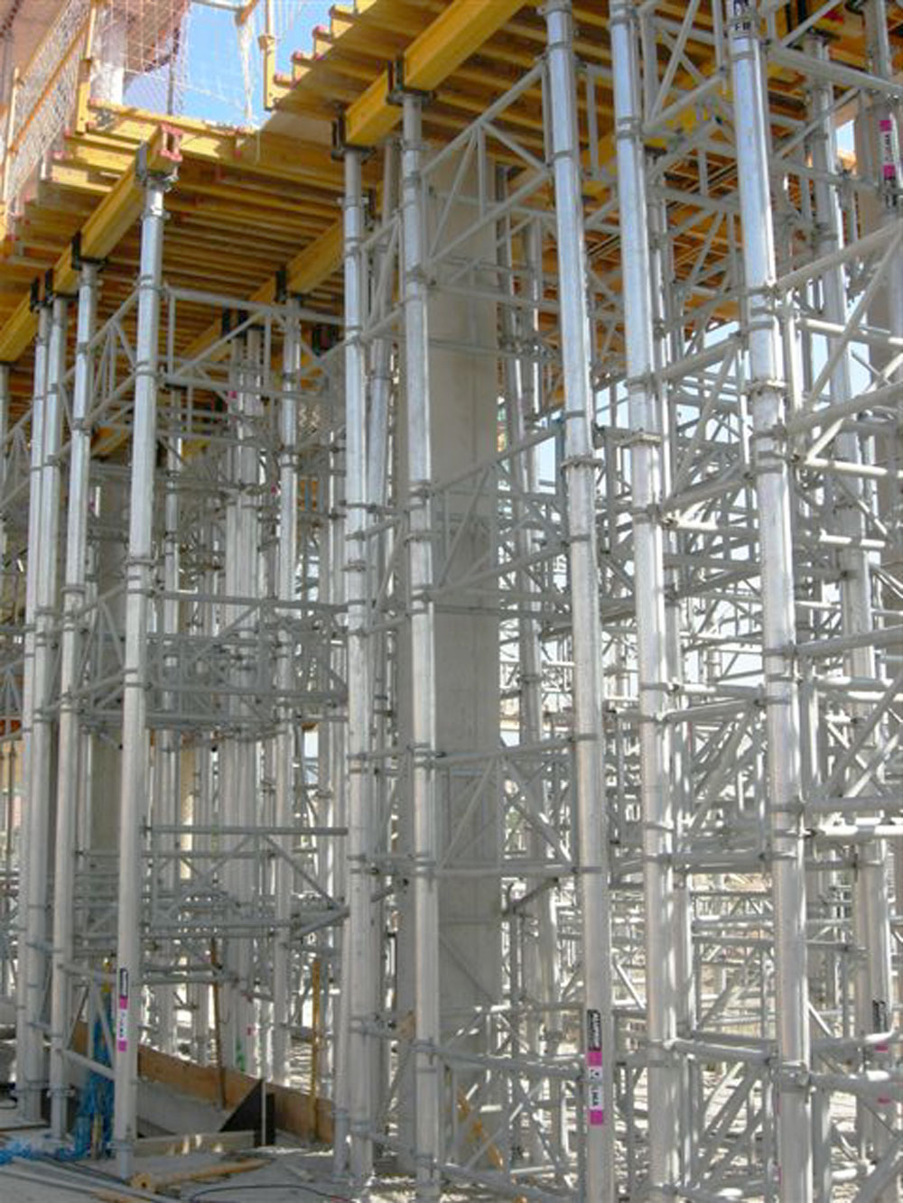 The concrete slabs were executed on sitewiththe CC-4 Formwork. As shoring, ALUPROP Aluminum Props were used to form easily handled towers. In this manner, the necessary heights for propping the upper parts of the stands were safely reached.