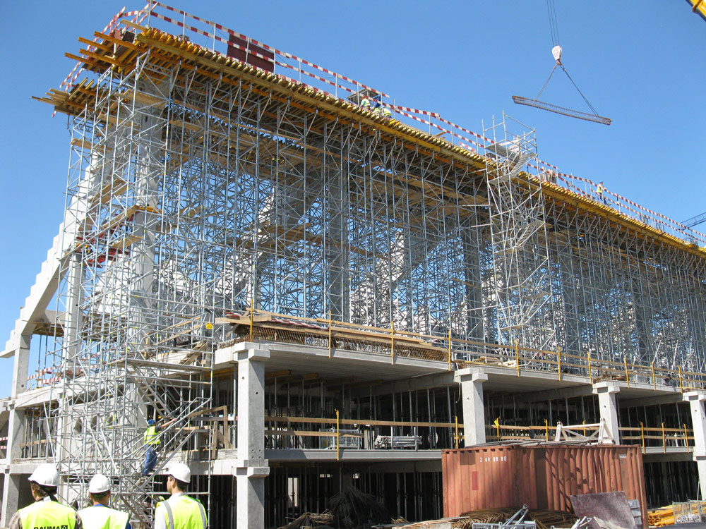 The construction work began simultaneously in three of the four stands (north, south and east). The foundations, slab heights, walls and elevator shafts were executed with the efficient NEVI Vertical Formwork system. Due to the high architectural requirements, 60 x 80 cm columns were set up with the modular ORMA system, which allowed to obtain a column dimension of 115 x 115 cm with the same panels. Both modular systems displayed their profitability, since their panels may be joined using a minimum number of pieces.