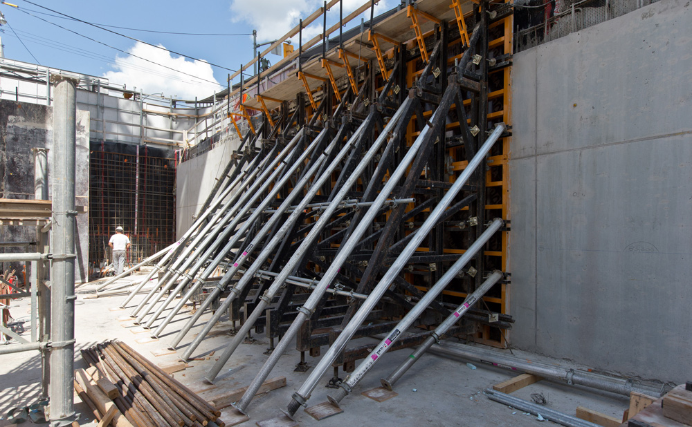 Furthermore, CC-4 aluminium formwork was used for the underground car park slabs and the ORMA Modular Formwork, underpinned by EUC trusses during the execution of the walls. The upper slabs were executed using table trusses with ALUPROP falsework props.