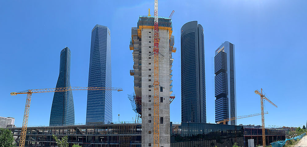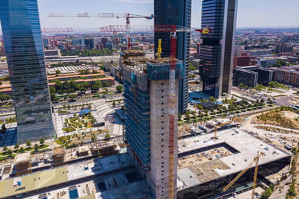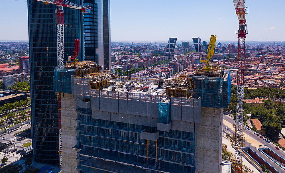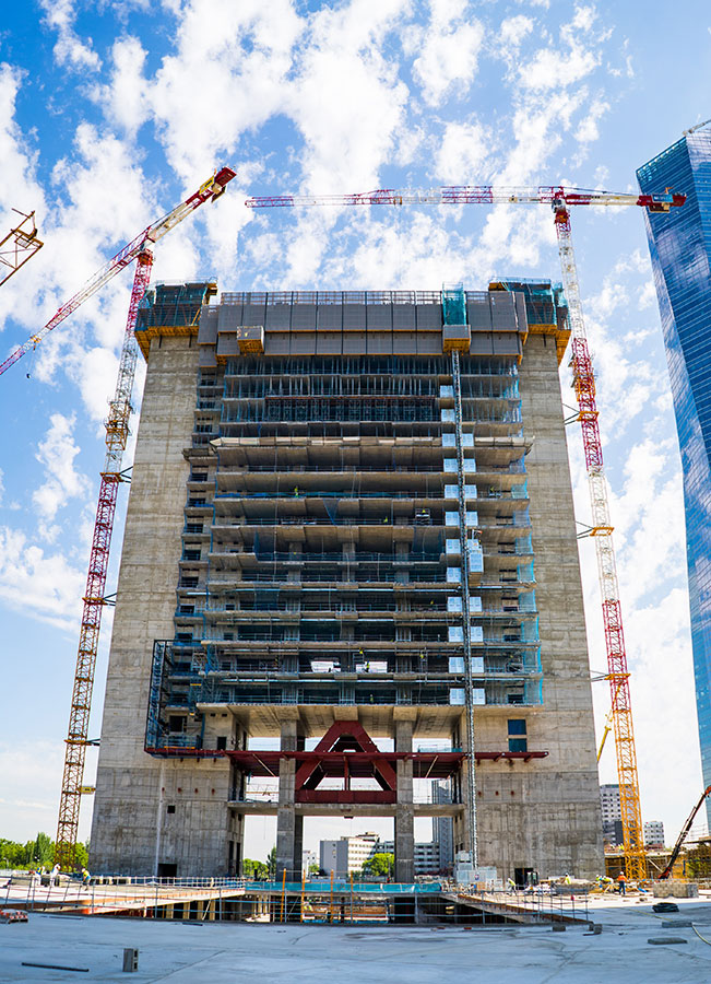 The tower’s frame from storeys 0 to 35 is composed by two distinct cores of 1,000 m², with five cavities each, joined by a central slab. With the ATR Self-Climbing Formwork System and the V-100 Timber Beam Formwork System, the concrete cores were built in weekly cycles with hydraulic lifting systems that made cranes unnecessary. The execution of the cores and slabs has been carried out simultaneously.