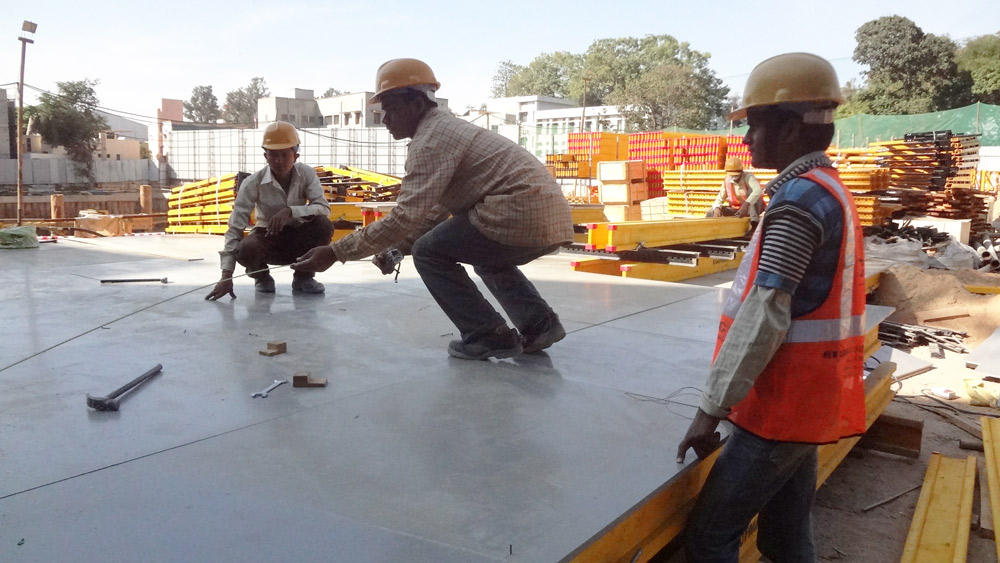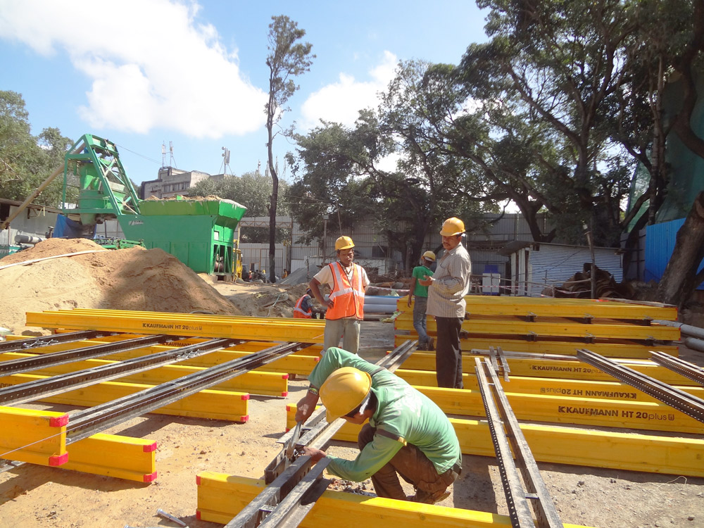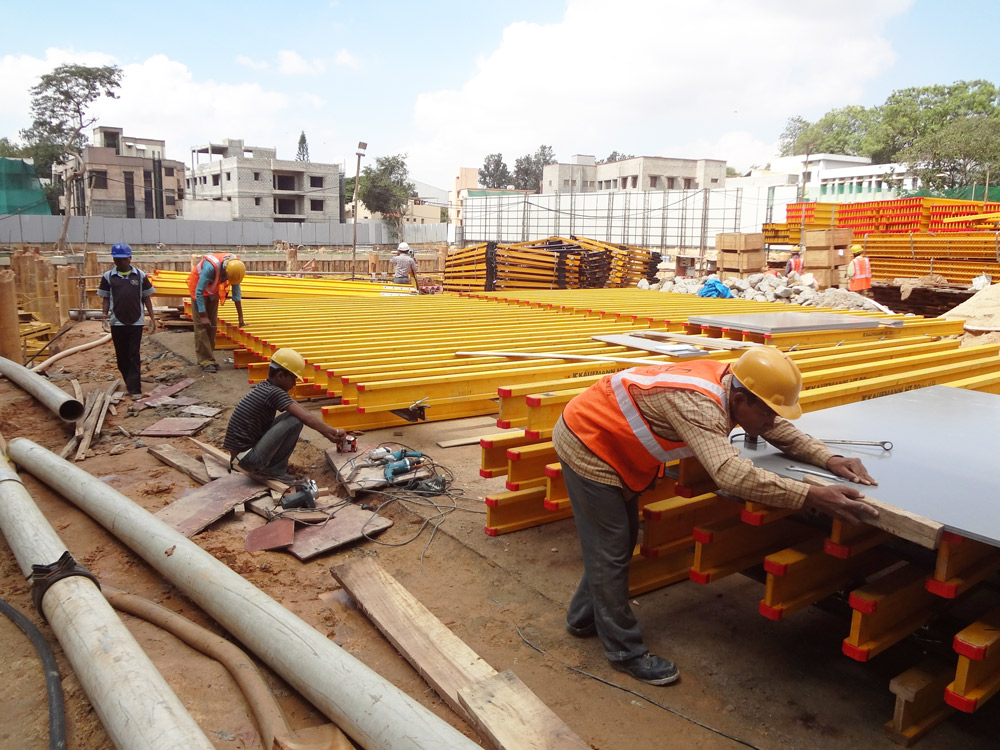 The central core was built one or two levels ahead of the slab construction. ENKOFORM V-100 wall formwork was used for the outside face of walls in combination with BMK Climbing System, and with KSP Shaft Platforms for the inside faces. Each pouring cycle lasted 9 days.