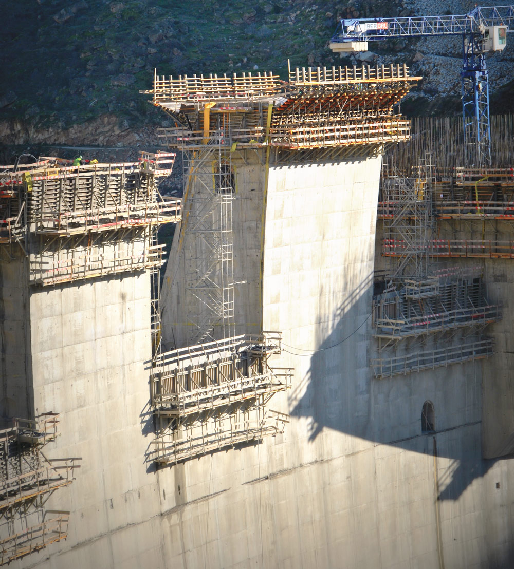 For the construction of this 127 m high and 505 m long dam, ORMA, BIRA and ENKOFORM V-100 vertical formwork was used. Single-sided climbing brackets were used, in addition to supplies of shoring systems, BRIO Modular Scaffolding and BRIO Ladder. More than 860,300 m³ of concrete were poured.
