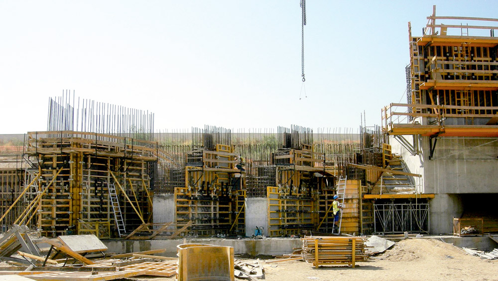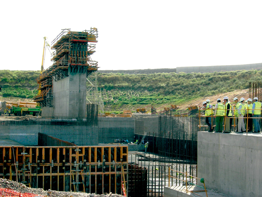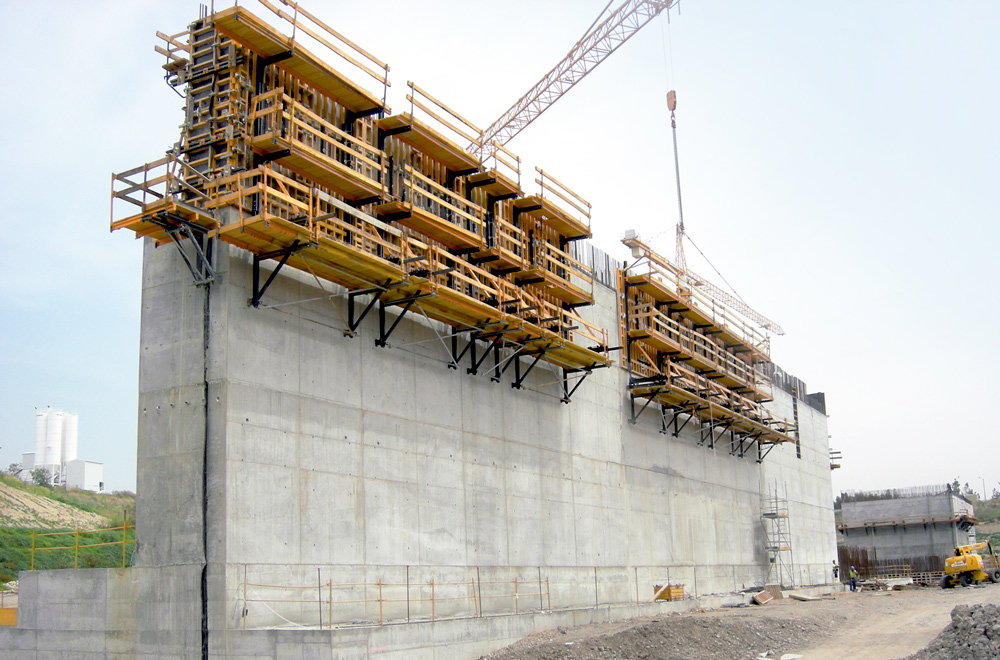 The screens, diffusers, buttresses, garages and counter-garages were built with climbing brackets and ORMA formwork. This was the best solution for this kind of structure because of its fast erection. Additionally, in these same areas, special vertical walers were designed for single-sided 4.5 m climbing, with controlled concrete pouring pressures. The canal galleries as well as the diffusers had slabs of up to 2 m thickness, which were cast with falsework and ENKOFORM HMK Formwork.