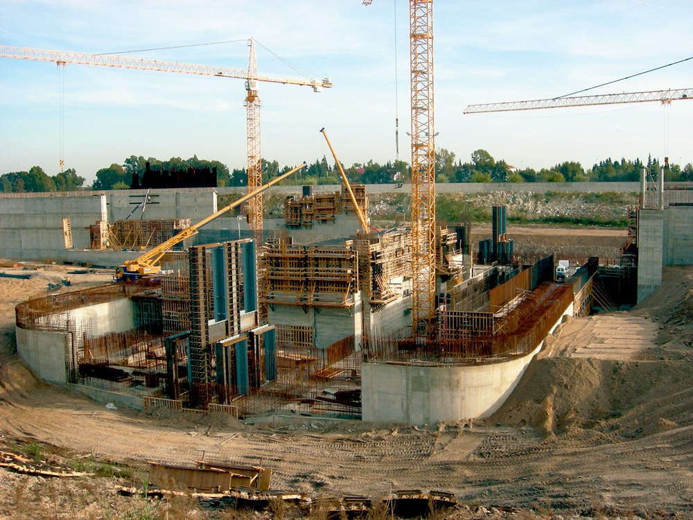 The entire structure has a height of 17 to 19 m over the foundation and involves a total of 81,000 m³ of concrete. The foundations were made using ORMA vertical formwork, with two 2.5 m layers in the garage area and with one 3 m layer in the other areas. In the first area, BIRA Circular Formwork was also used.