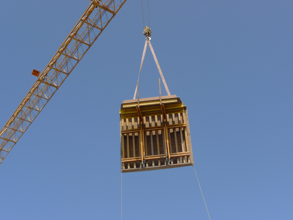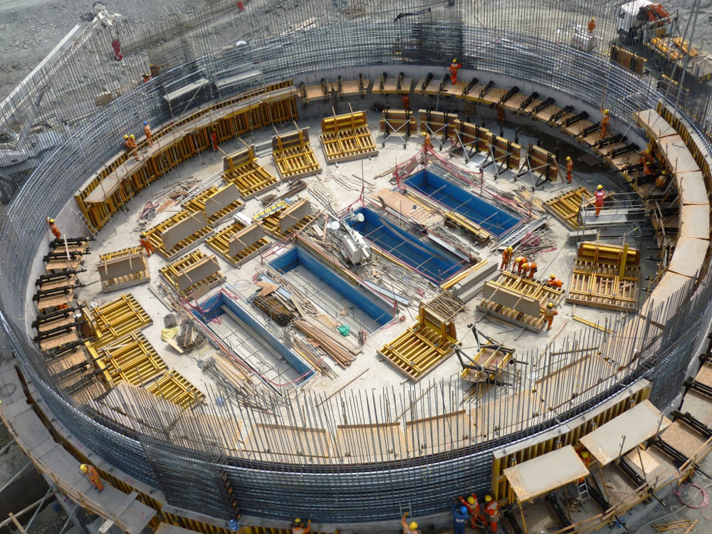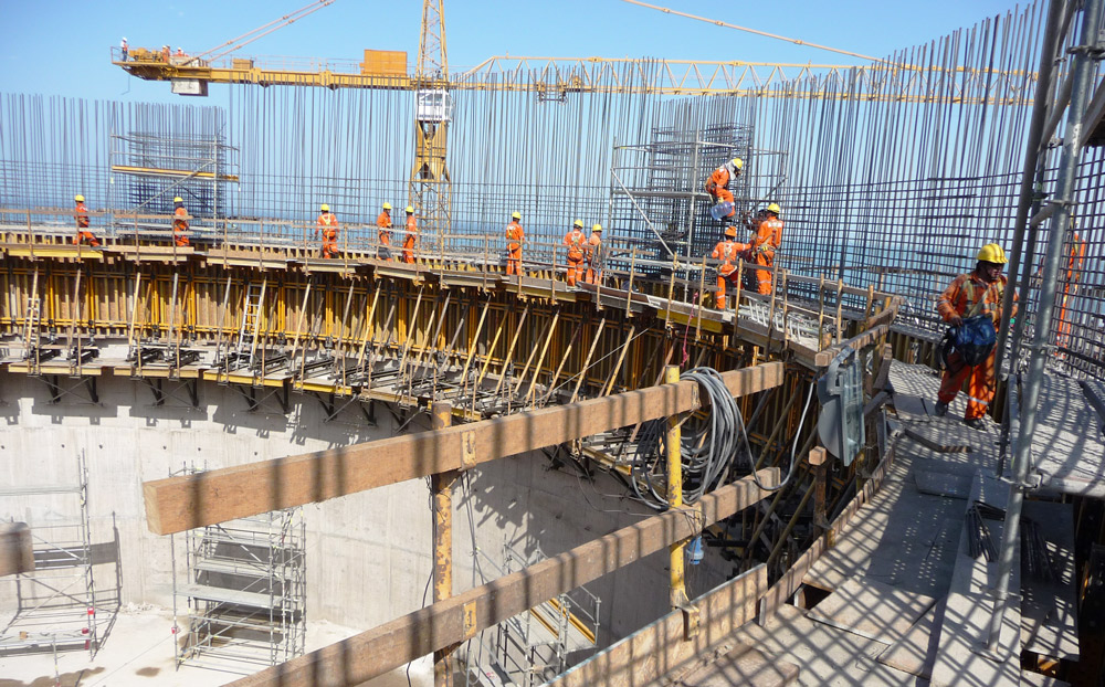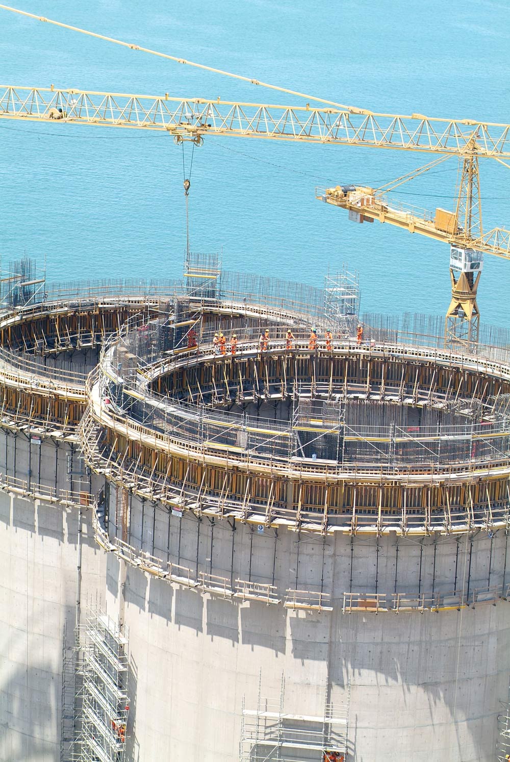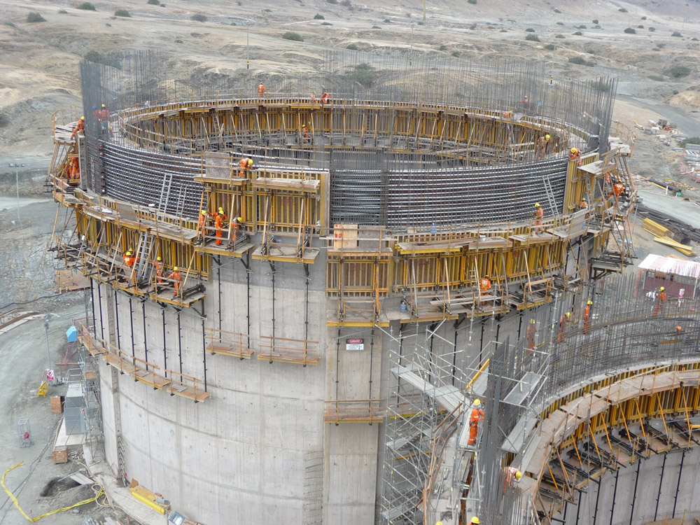 ULMA faced a challenge: the construction of two large silos. Each of 33 m in diameter and 55 m height, they consist of 0.4 m thick reinforced and six 0.7 m thick solid concrete walls, located every 60 degrees at the perimeter of each silo.
