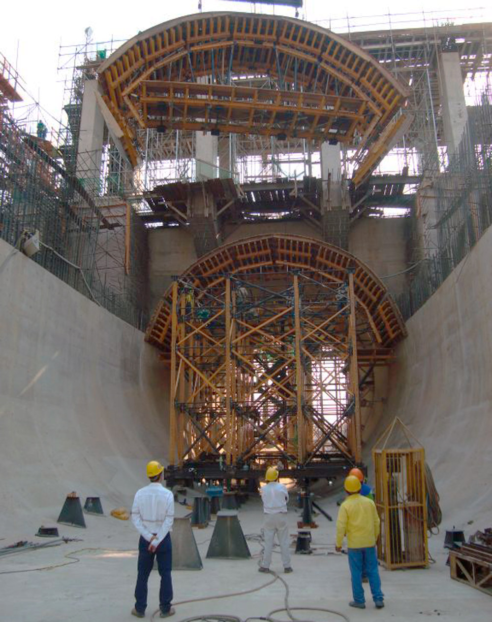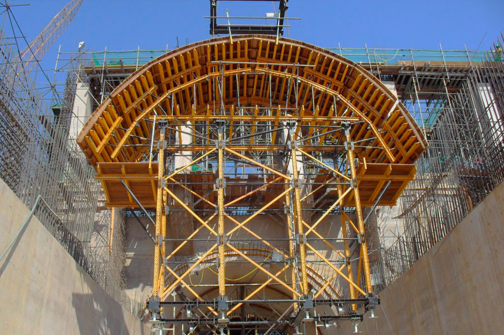 To cope with the dimensions of the water intakes (18 m high and 2.5 m thick), a solution with two mobile MK-360 Shoring towers and ENKOFORM HMK and VMK formwork was designed. Erection and dismantling tasks were considerably quicker with a form carrier with rolling system moved forward from stage to stage.