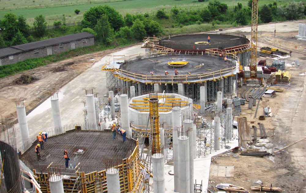 The 80 cm thick bottom slab of the tanks was shored on T-60 towers, EP props and chain-linked ALUPROP shoring towers.