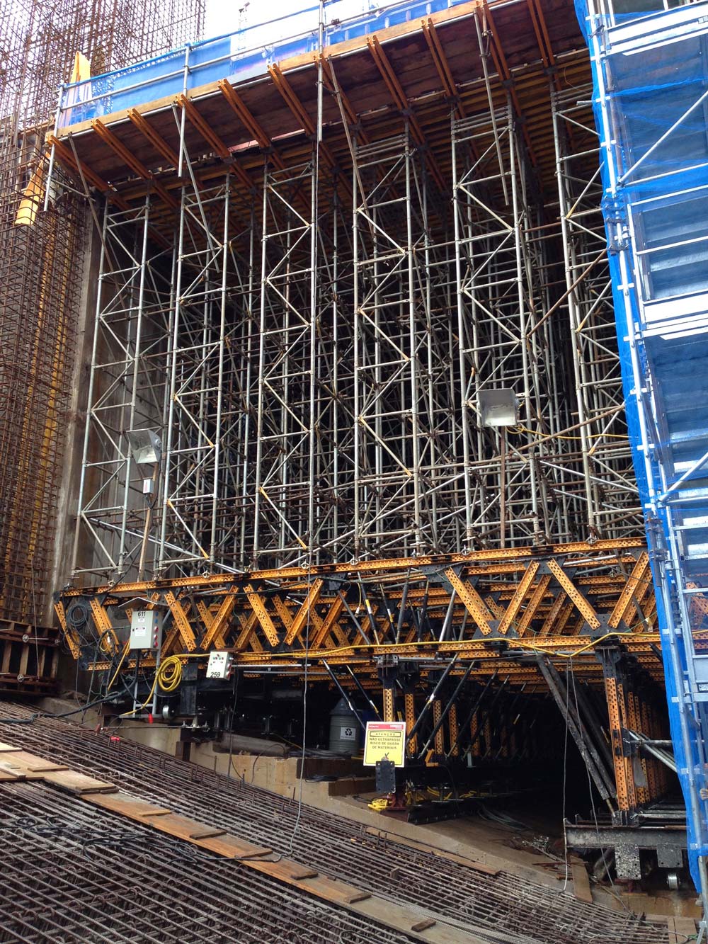 The HMK slab formwork was used without the MK form carrier, but with effective bracing and blocking between towers, these were moved with the Lateral Trolley VR.