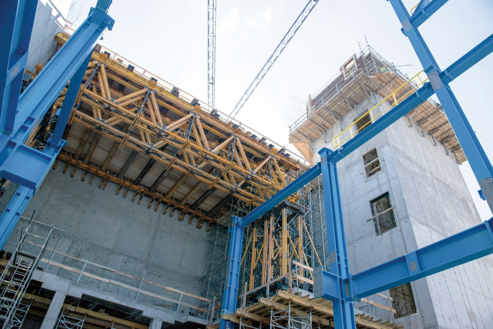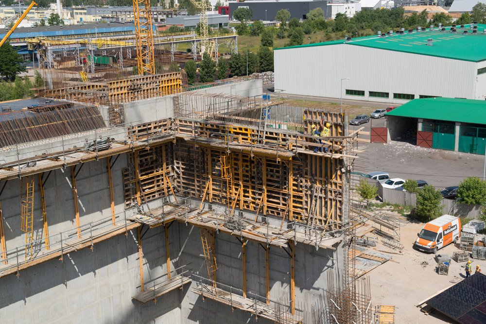 The next step was done at the bottom of the building. The 2.65 m high walls were built with SMK trusses and 2.70 m high ENKOFORM V-100 beam-based formwork panels. The tallest walls were built with BMK climbing brackets supporting 5.4 m high ORMA formwork gangs. Due to the system's efficiency regarding costs and time, it could be reused for the walls of other facilities.