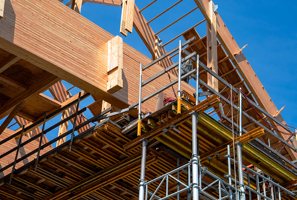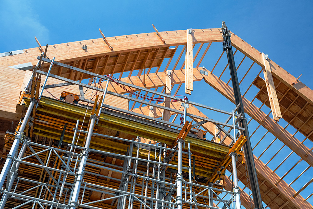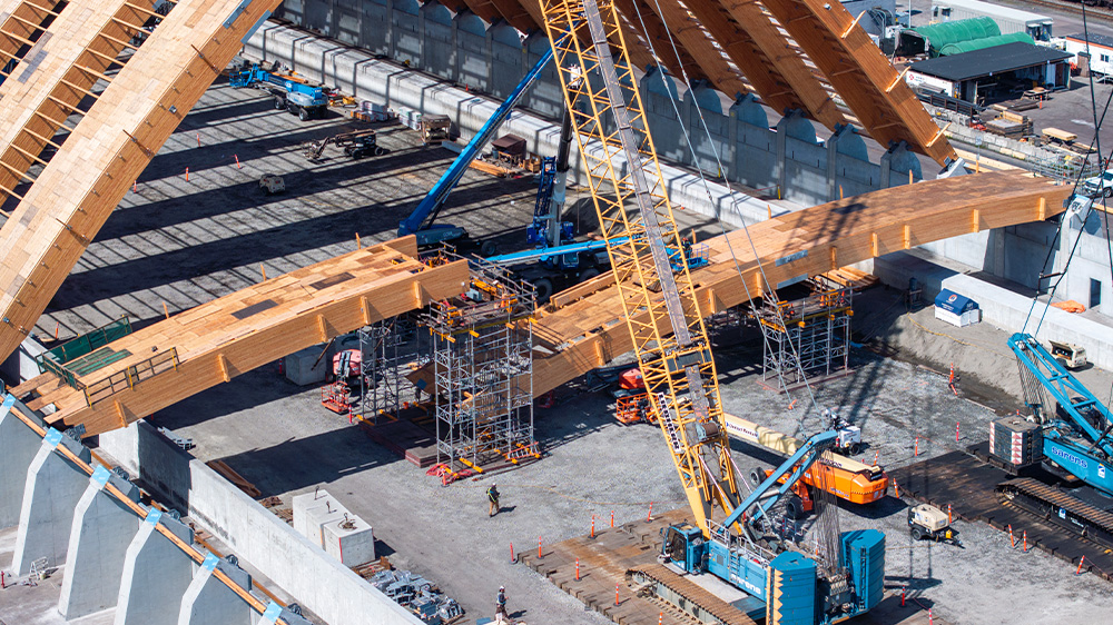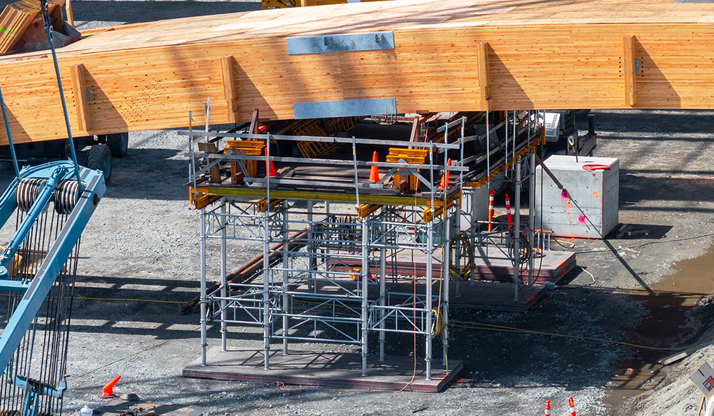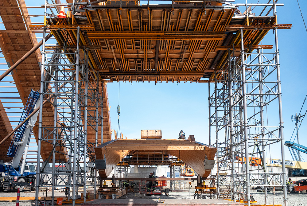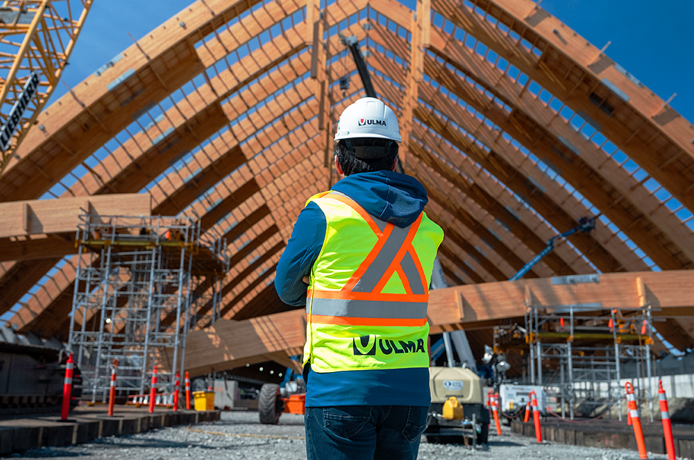 ULMA Construction Systems Canada was selected to provide the shoring and working platform solutions for the assembly of the arched timber structure, a critical component in the overall construction sequence.