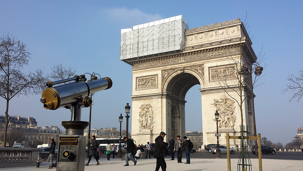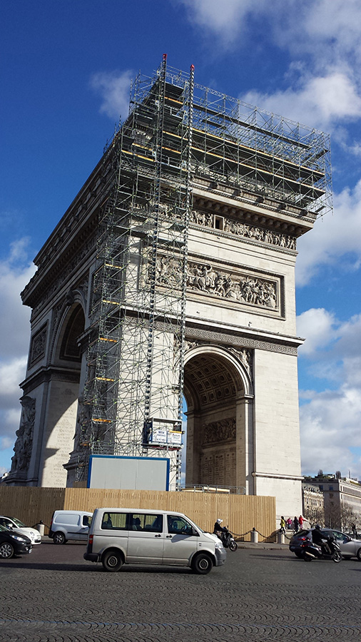 Located at the end of Avenue des Champs-Élysées, the Arc de Triomphe stands at 50 m in height, 45 m in width, and 22 m deep. The iconic structure was fully restored.
