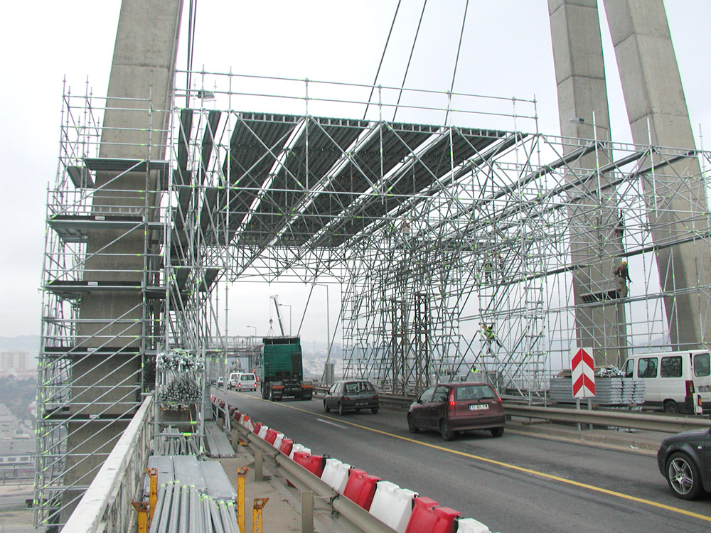 This was a restoration project of a bridge built over the Mondego River. Specifically, the pier was restored to an "A" shape. The job was confronted with considerable dimensions at a height of 80 m.