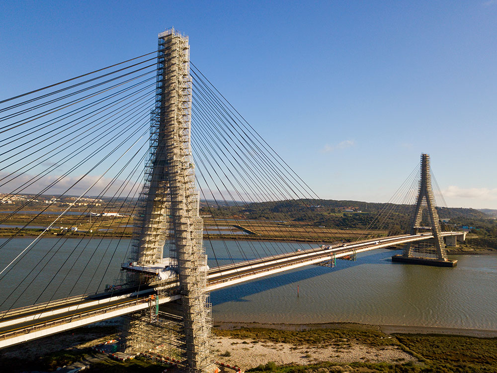 - In order to permit the continued flow of traffic between Spain and Portugal, two protective gantries – one for each pylon – were installed in an extremely limited space so that the renovation could be undertaken without interrupting the flow of traffic. In order to adapt to the limited space available and withstand the load of the scaffolding structures, the gantries were made from heavy duty T-500 Shoring Towers combined with intermediate metal beams and ENKOFORM.