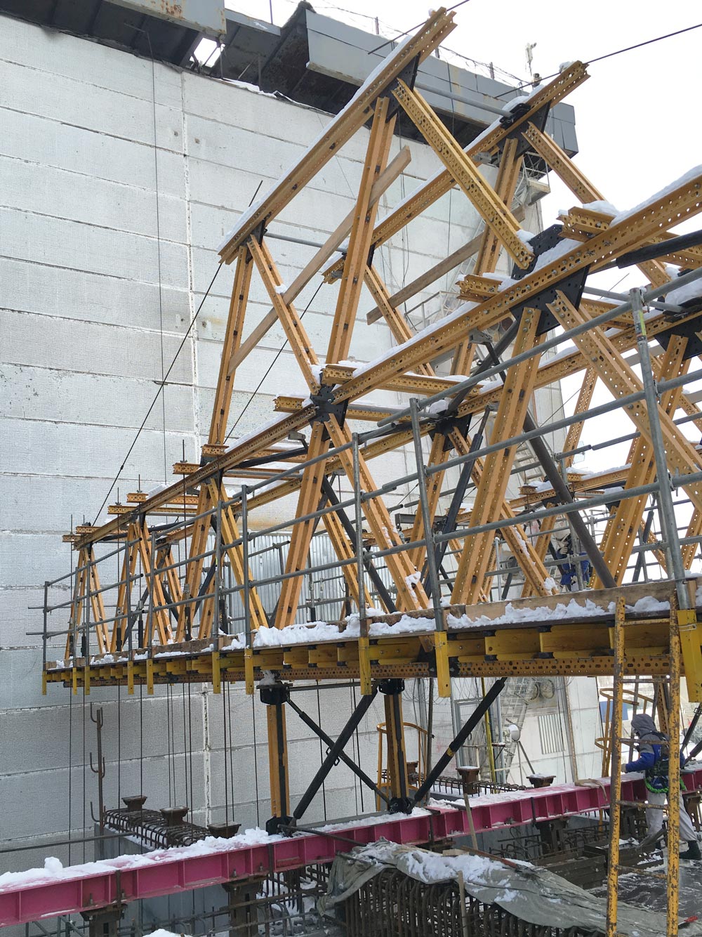 The MK system was used to form cantilever structures measuring 2.5 m in height and 8 m in extension, which allowed the roof to be built without a need for direct ground-level access.