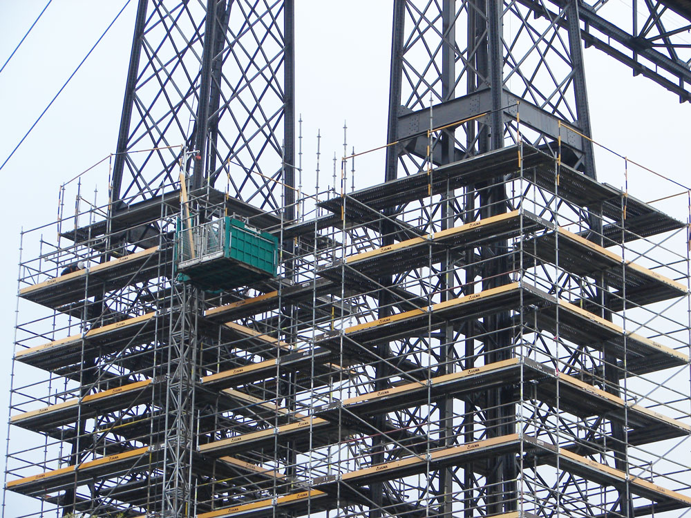 The scaffolding structure of the towers was also used for the fitting of the builder's hoist support platform. This platform was made with scaffolding platforms resting on 5 m long bridging beams at a height of 7.5 m.