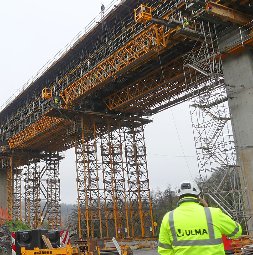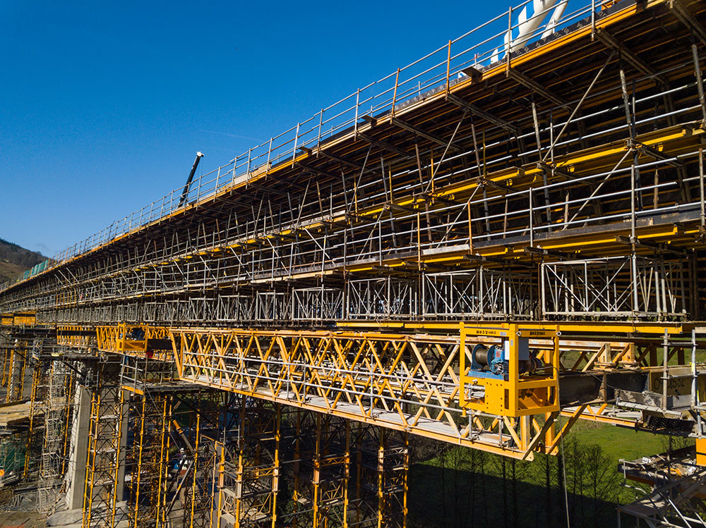 Given that the area is both logistically important and features complex terrain, open frame protective BRIO scaffolding was installed. Moreover, to avoid blocking traffic on the busy road underneath and prevent falling objects, the structure was designed so that that it could also function as a support for the formwork gangs during the stripping process.