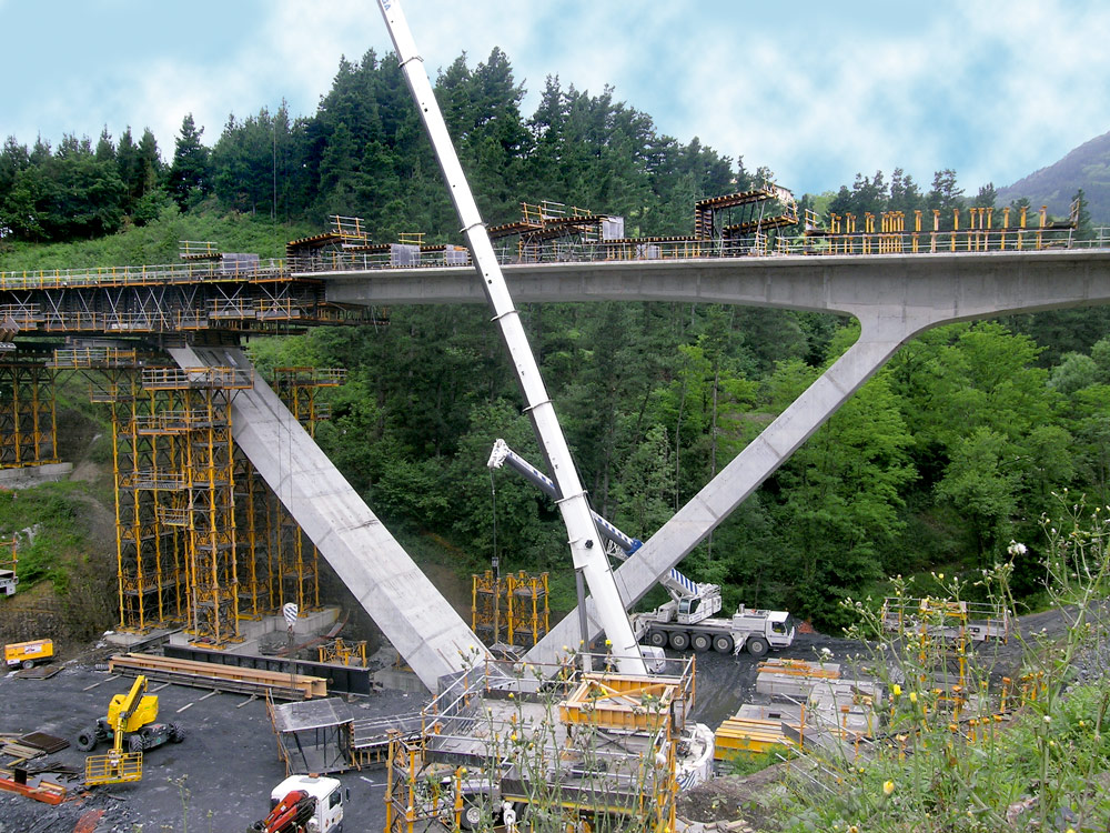 The Basagoiti viaduct is 427 m long and consists of three V-shaped piers, with 35 m spaced bearings, anchored to a plinth. The cross section is rectangular, 2.25 m high and 5.50 m wide. The axes of the bearings form a quasi-right angle.