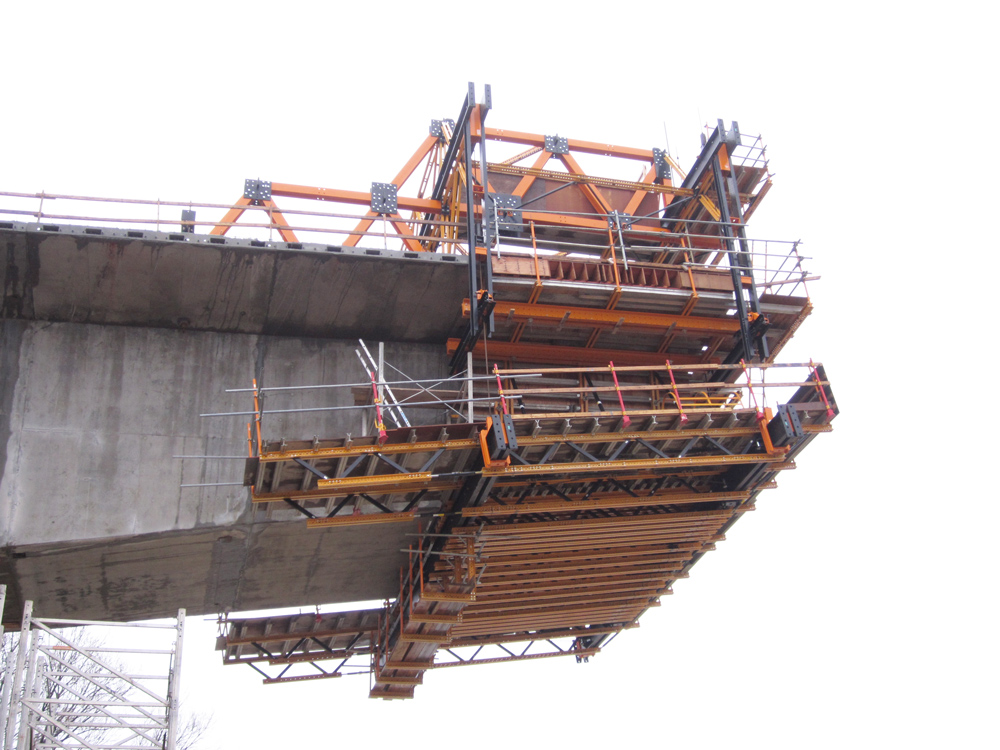 Based on the modular concept of the MK System, this form carrier adapted well to the different cross-sections. The inside and outside formwork was independent from each other which allowed of shorter work cycles. The use of MK standard components reduces the weight and costs of the equipment compared to other custom-made form carriers.
