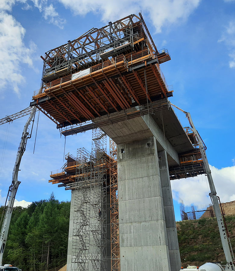 The pier segments reaching 11 m in length were poured on piers measuring 22.6 m and 20 m in height, respectively. In order to do so, a grid-work of DIPE450 and IPN500 steel beams were supported by the piers so that tall shoring systems were unnecessary. HMK Bridge Deck Formwork was used for the base and sides of the box-girder deck, due to its ability to adapt to varied geometry.