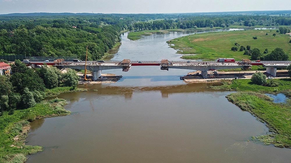 The S3 route in Lubuskie voivodeship in Poland is now a huge construction site in many places. Now, the construction of the section from Sulechów to Nowa Sól is ongoing. As part of this investment, a new bridge on the Odra River in Cigacice is being built. This bridge is built on two sides of the river and now is almost connected. It is planned that the project will be finished by the end of 2019.