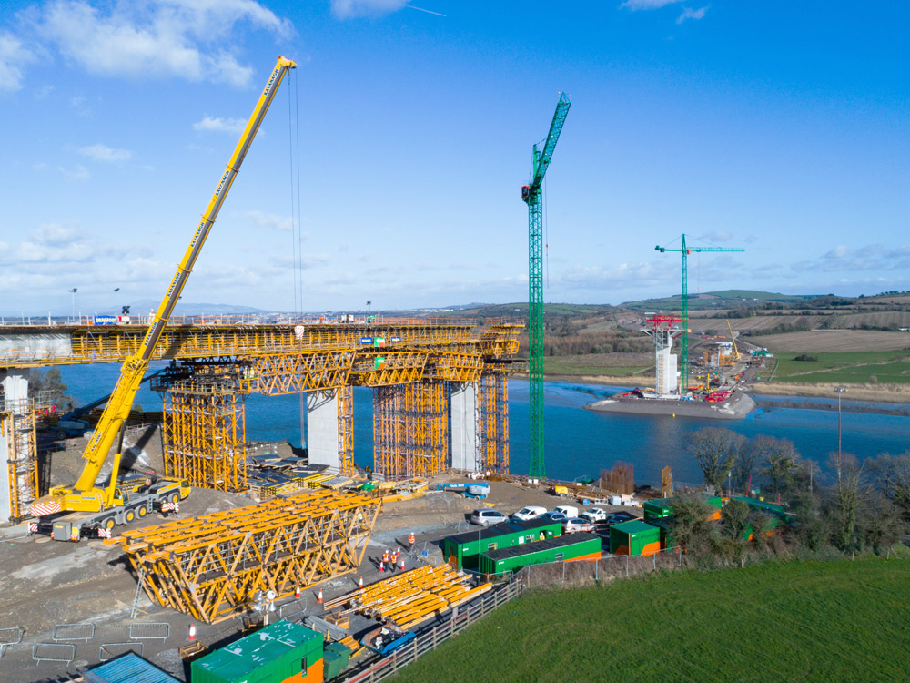 The bridge over the Barrow River, is an extradosed structure 887 m in length, making it the longest bridge of its kind in the world. This type of bridge is characterised by its cables set at lower angles, meaning that pylons are shorter in relation to deck span lengths.
