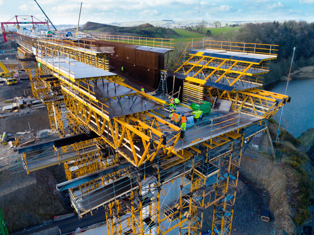 The 21 m trusses and 36 m shoring towers are extremely durable with a high load-bearing capacity, easily capable of spanning large distances, making them indispensable in the soft ground present on both sides of the riverbank.