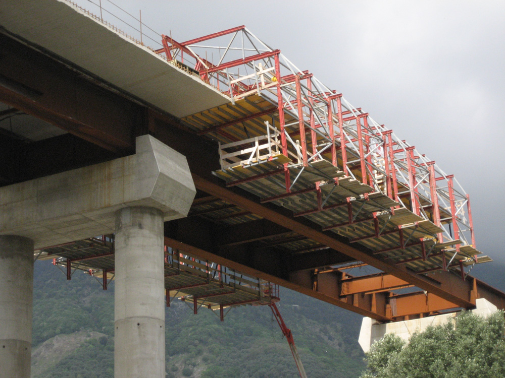 The form carrier structure has eight transverse trusses which carry the wing formwork. It moreover includes working platforms and two trusses supporting the structure that moves on rails.