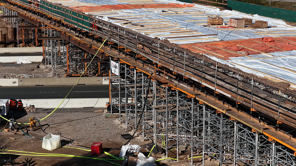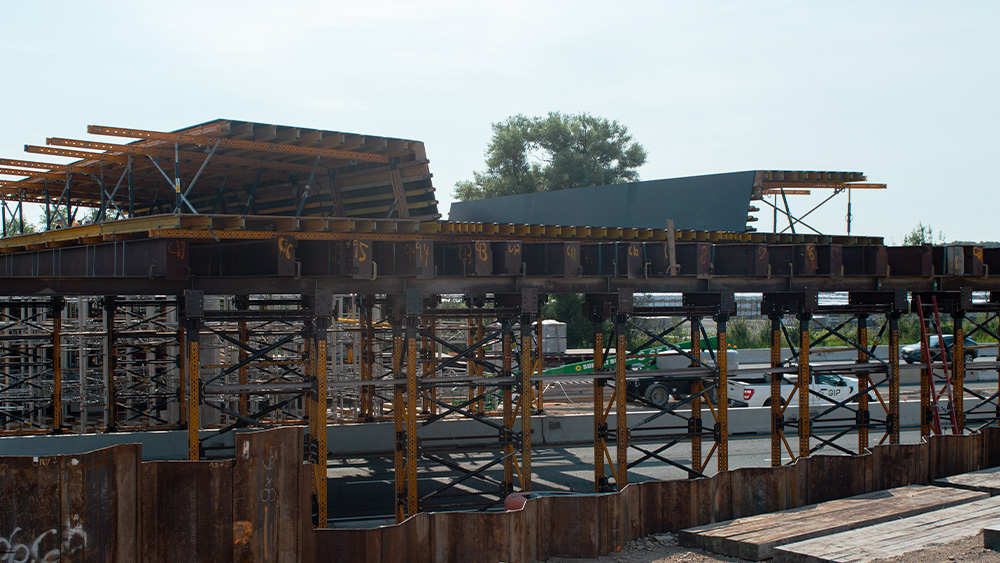 - The design required two separate openings with 15-meter-long spans under the formwork, to allow for continuous traffic flow below in both directions of Highway 401.