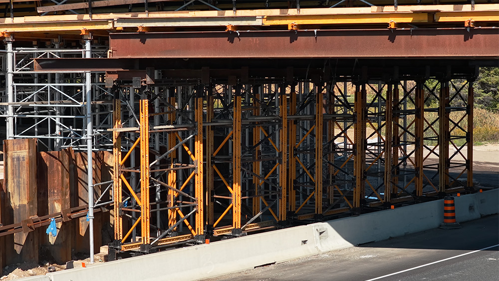 The new bridge is a 1.9-metre-deep, post-tensioned cast-in-place concrete girder with a service opening to facilitate future inspections and maintenance. Maintaining uninterrupted traffic flow on Highway 401 during construction was a primary requirement, demanding precision engineering and reliable shoring and formwork solutions.