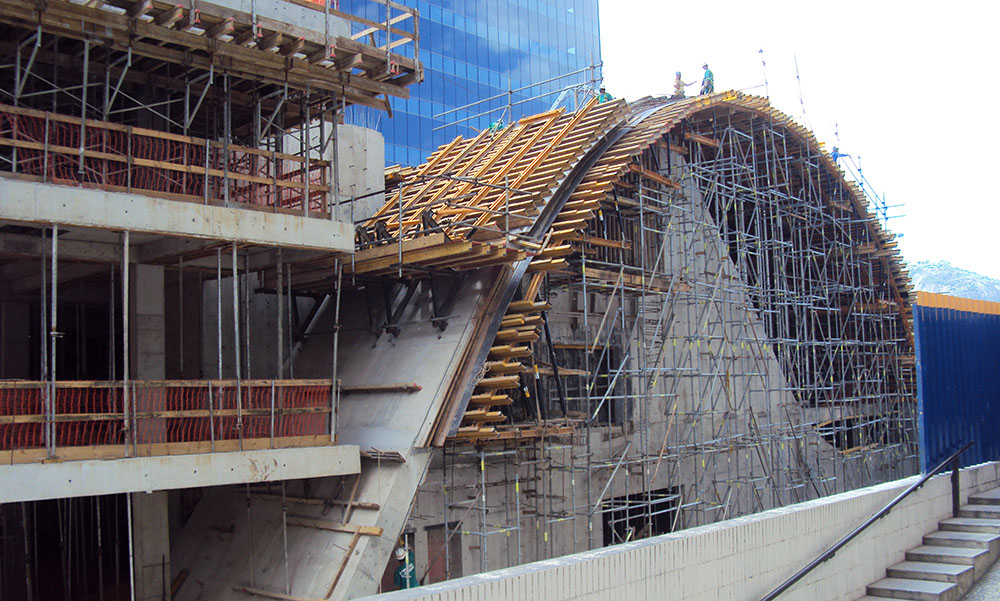- Protected shoring system. Large working areas and handrails on the top level for formwork placing