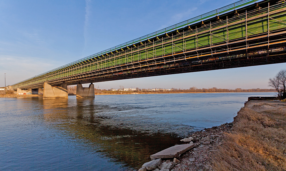 Suspended working platforms were installed from the bridge beam. The work was carried out under constant vibration and traffic, hence both the bottom and top part of the structures in both directions were reinforced with BRIO scaffolding elements. Platforms were created by combining elements of the MK System and the BRIO scaffolding. These were suspended below the span and equipped with an anti-slip surface for safe working. The IPE profiles acted as guide rails for the repair carriage. The communication and stiffening between the two solutions was achieved using components of the BRIO system.