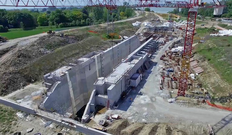 In order to prevent structural weaknesses in this fluvial structure, the dock was constructed in a monolithic pour without any joints. The structure covers 4,000 m2 and measures 115 m in length and 12.50 m in height, increasing to 23 m in depth at the lateral docks.