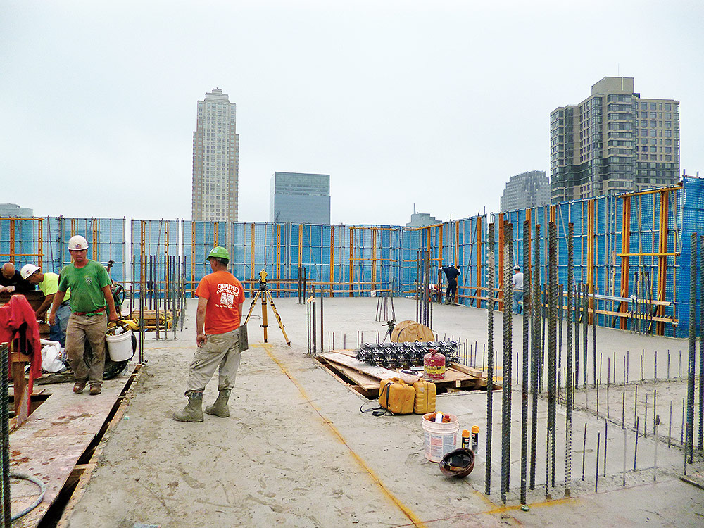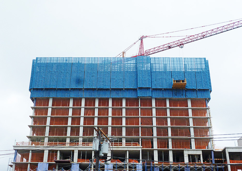 In order to ensure a safe working area, the building perimeter was covered with self-climbing HWS protection. The system is made of panels that envelop the storey under construction and three storeys below, equipped with a hydraulic system used for raising the assembly as construction proceeds upward.