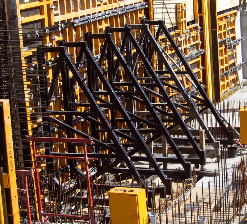 - Fixation rapide et facile des panneaux au moyen de têtes. Fixation au sol avec les ancrages perdus laissés dans le plancher de béton antérieurement coulé; la pression de béton est transmise à ces ancrages et au sol par l'intermédiaire de la structure.