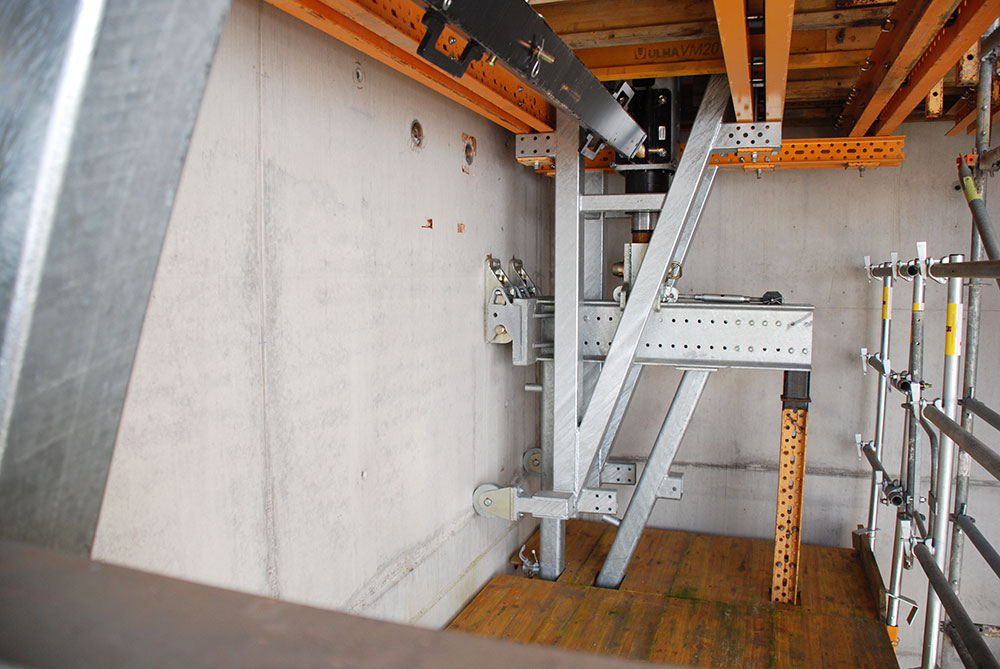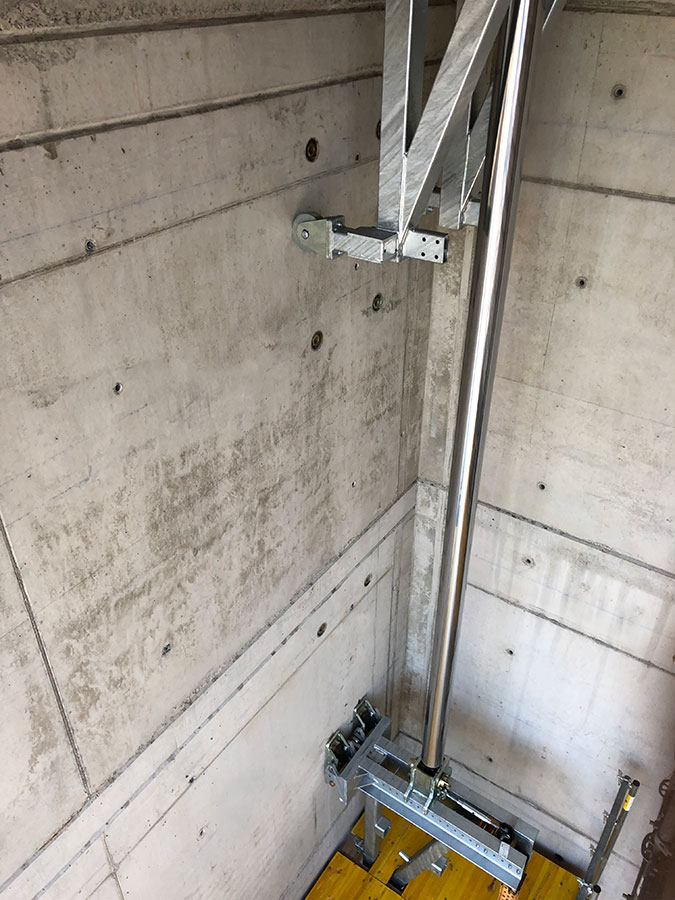 Le système est soulevé de façon souple par un vérin à course unique, sans rail de guidage, simplement soutenu et guidé par les murs réalisés antérieurement.