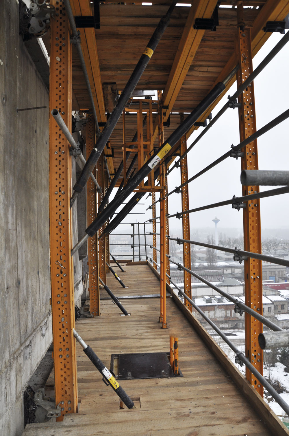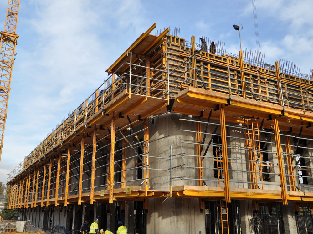 Le RKS est un coffrage grimpant guidé par des rails qui permet l'escalade hydraulique sans détacher le coffrage du mur. La structure d'escalade se fonde sur des profilés MK (système MK), qui offrent une polyvalence et une adaptabilité sans égal aux exigences d'un chantier de construction, telles que la géométrie de l'immeuble, la configuration des plate-formes de travail et les points d'accès de sécurité.
