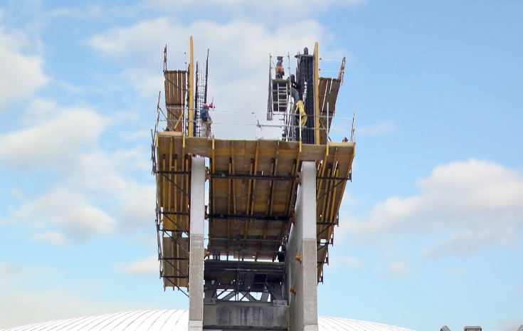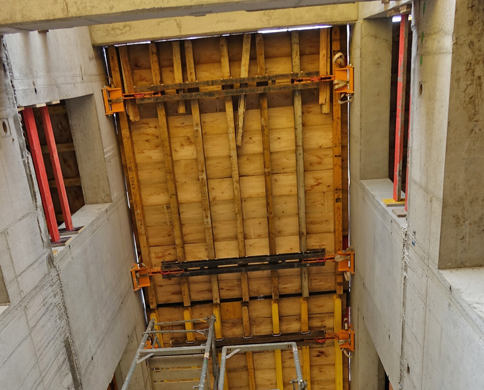 Il s'agit d'une plate-forme de soutien de coffrage, qui est employée pour les puits d'ascenseur et d'escaliers, les piles creuses ou d'autres types de puits où le soutien du coffrage est nécessaire. Elle réunit habituellement des supports grimpants classiques sur l'extérieur du mur.
