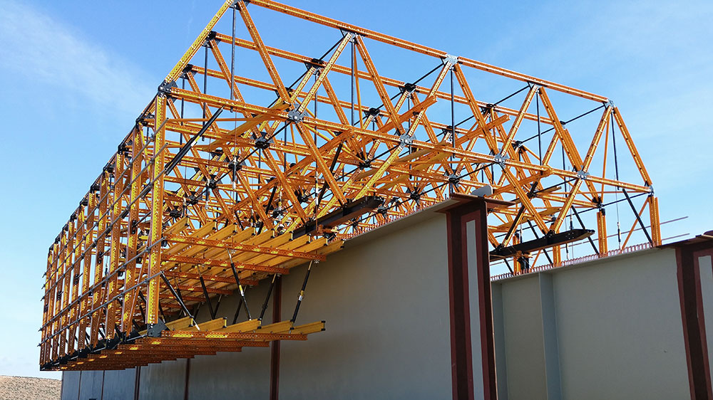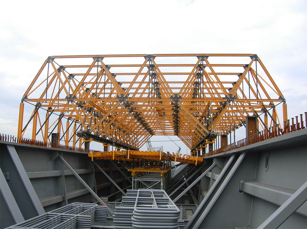 Le chariot de coffrage de pont en composite, MK, est un système flexible et efficace de coffrage, principalement focalisé sur la construction de ponts métalliques et partiellement préfabriqués pour lesquels le bétonnage des brides du tablier du pont s'avère nécessaire.