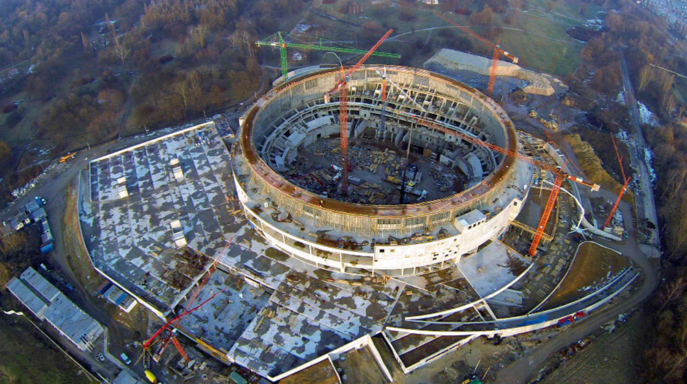 Après plusieurs années de planification, la plus grande arène sportive de Pologne a finalement été construite à Cracovie. Il présente une superficie totale de près de 97 000 m2 avec l’aire de jeu principale qui mesure 4 300 m².