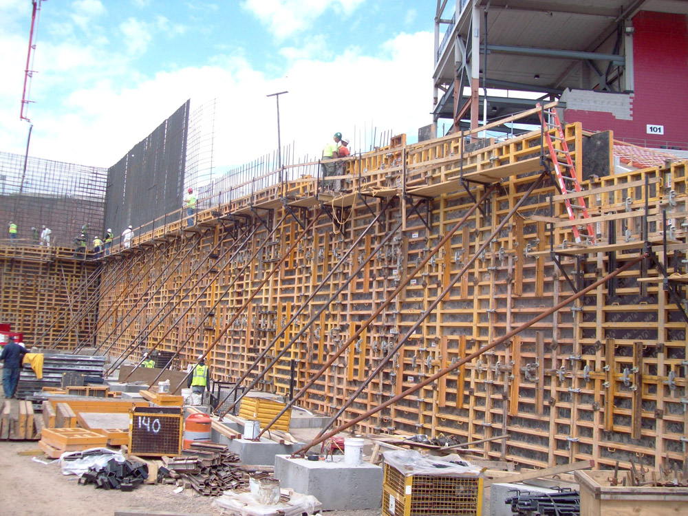 Le court calendrier d’exécution de ce stade de football a exigé des solutions efficaces en termes de produits (systèmes de coffrage et de chevalement) ainsi qu’en logistique d’approvisionnement puisque cette construction devait être réalisée en moins de six mois, pour l’ouverture de la saison de football.