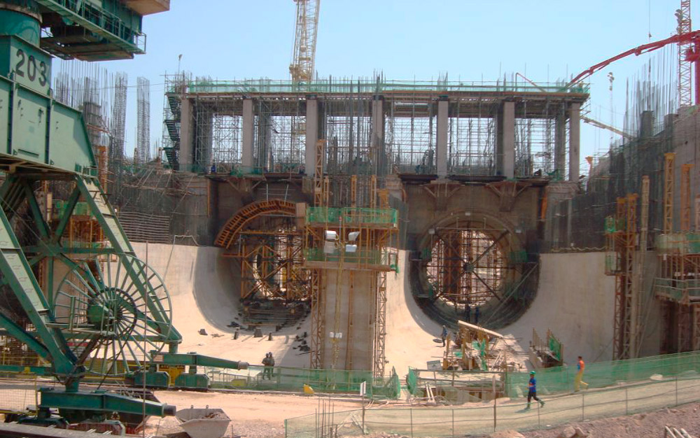 Au vu des dimensions des prises d’eau (18 m de haut et 2,5 m d’épaisseur), la solution adoptée a été deux tours mobiles MK-360 et les systèmes de coffrage ENKOFORM HMK et VMK. Le montage et le démontage ont été considérablement facilités grâce au système de roulement qui positionnait le portique d’une phase à l’autre.