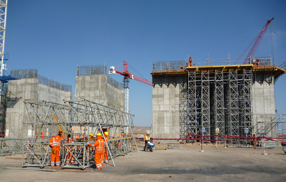 Pour la construction du broyeur (nord et sud), d’une hauteur de 33 m et ayant des murs de 2,10 m à 8,10 m, nous avons eu recours au système ORMA. Pour les dalles de 0,90 m à 2,10 m, le coffrage des poutres a été effectué avec des étais en aluminium ALUPROP.