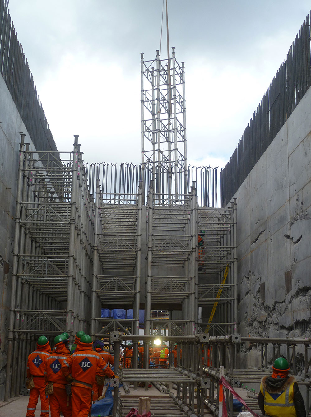 Pour les structures verticales, composées de murs de 1,5 m d’épaisseur, nous avons utilisé le coffrage modulaire ORMA, permettant un gain de temps dans les phases d’assemblage et de démontage.