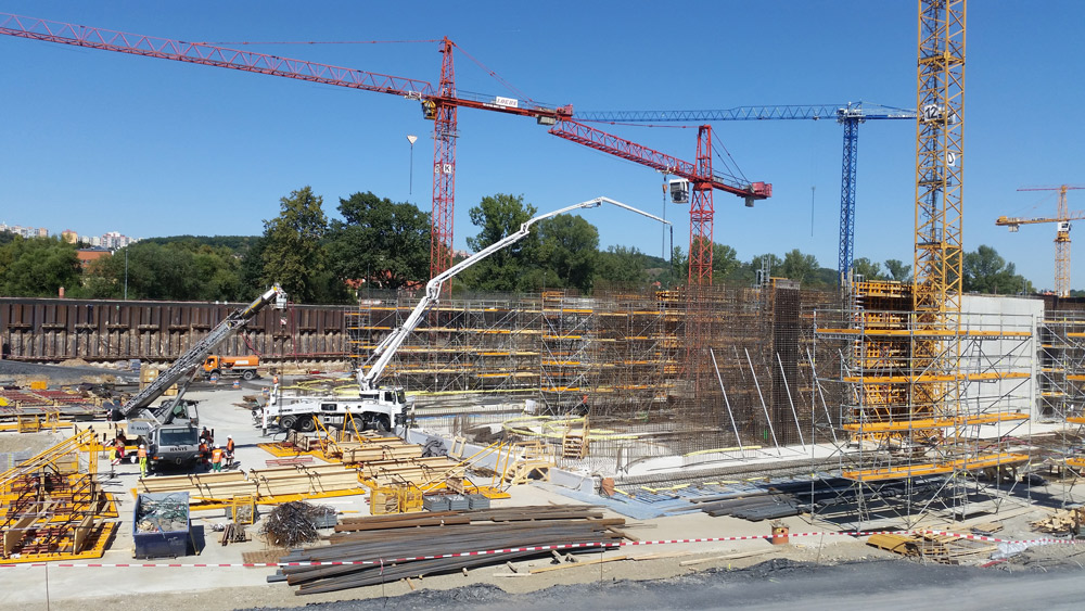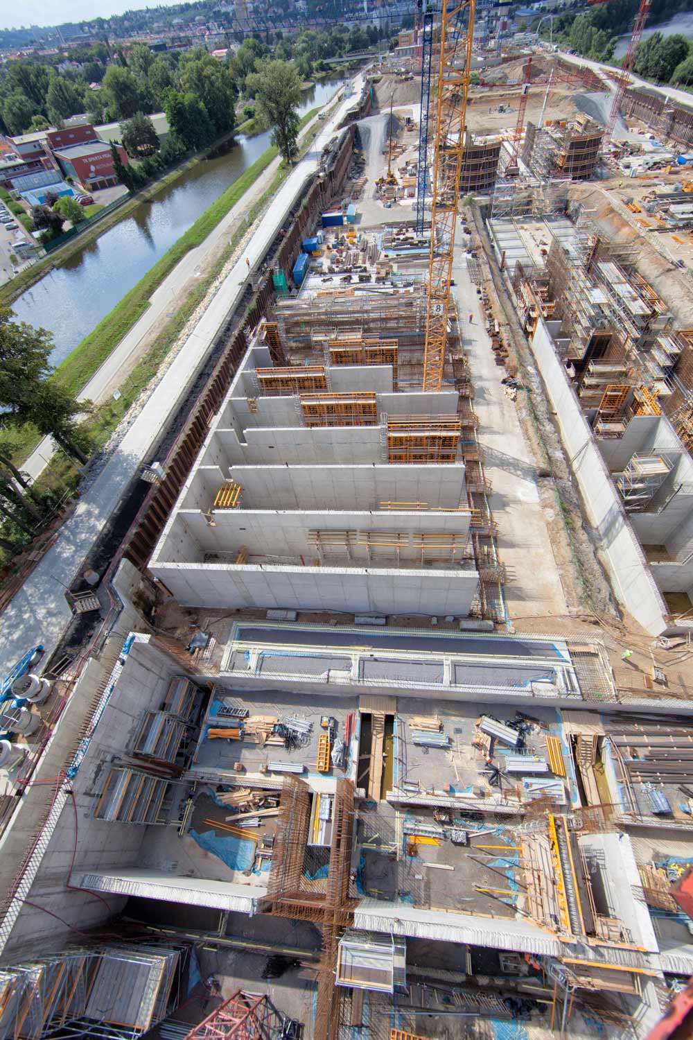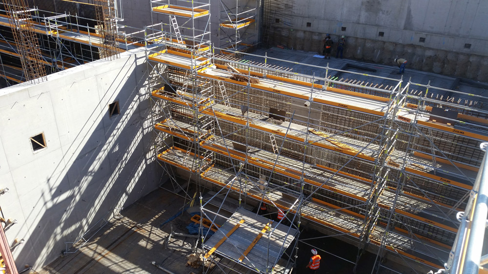 La circulation continue de l’eau et les technologies utilisées dans ces stations requièrent une exécution précise de la géométrie et des finitions. Comme solution, nous avons utilisé le système MK, à la fois dans son application verticale, ENKOFORM VMK, et horizontale, ENKOFORM HMK. Nous avons ainsi créé plus de 30 outils spécifiques. Parallèlement, afin de pouvoir bétonner les voiles de plus de 12 m de hauteur en une seule levée, nous avons eu recours au coffrage modulaire ORMA renforcé par des étais MK.