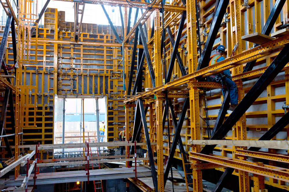 Étant donné que le client souhaitait couler conjointement le noyau central et la dalle complète (intérieur et extérieur) située au même niveau, nous avons laissé des espaces libres, sans plates-formes au sein de chaque cage d’ascenseur du noyau pour que, une fois la dalle bétonnée, les consoles et le mât puissent être hissés. Cela explique la nécessité de quatre structures de coffrage différentes et asymétriques, ainsi que les difficultés afférentes de contreventement et de répartition homogène des charges.